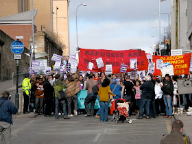 | The chap on the right offering a leaflet to a snapper is with the train drivers dispute, not the march |