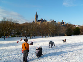 It is 8 January and we are off sledging in Kelvingrove Park. For the vandalism of the Stewart Memorial Fountain photographed the same day see